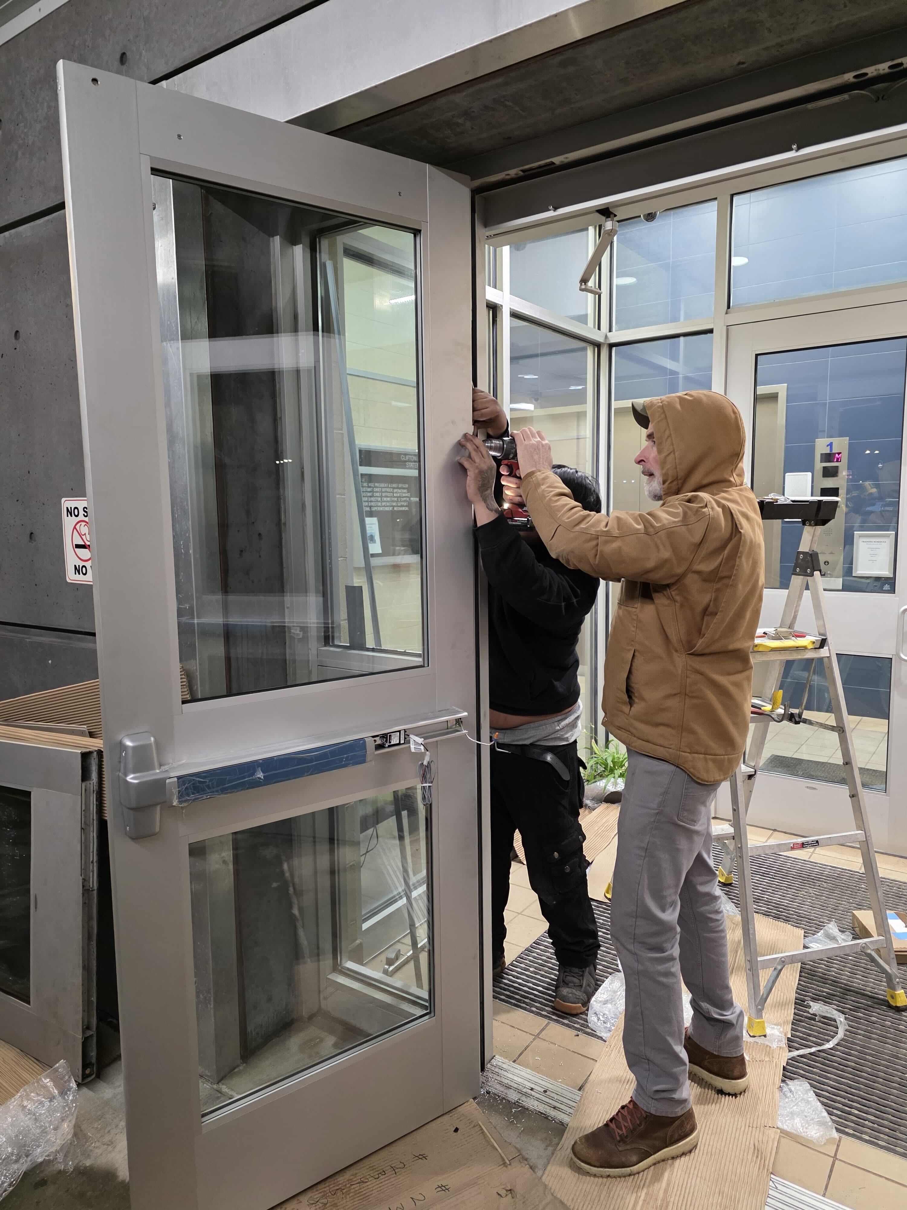 The scope included the installation of a new aluminum storefront, the addition of four ADA-compliant automatic operators (ED250s), and the replacement of mechanical components for a revolving door, along with the incorporation of curved glass.